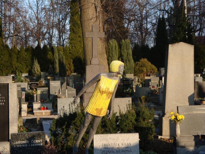 Denně okolo hřbitova, kde nás zdravila socha spoře oděné lyžařky